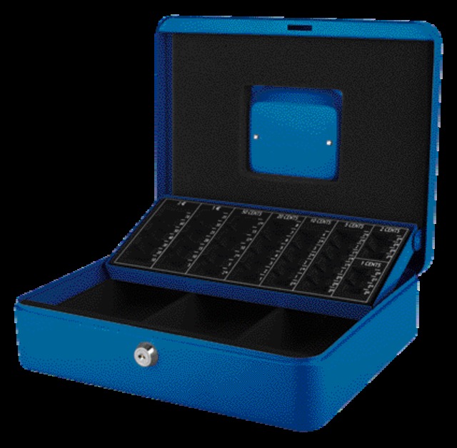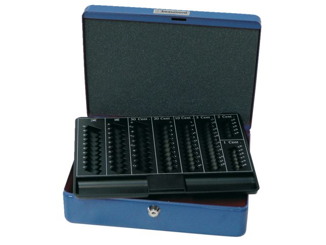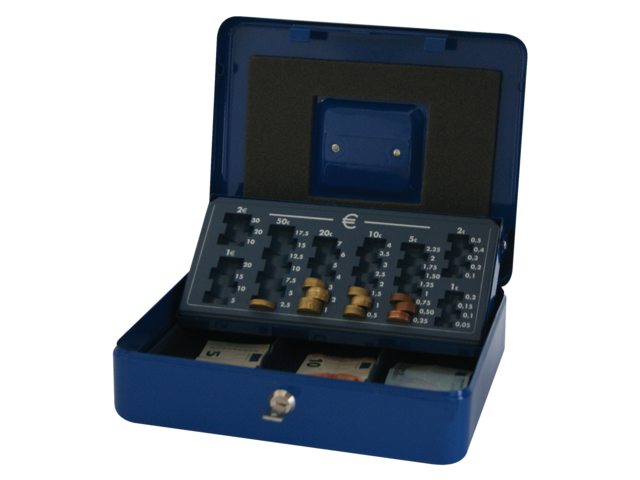 • Met muntensorteervak. Solide geldkist van staal met afgeronde hoeken. Met handvat, inzetbakje en cilinderslot met twee sleutels.