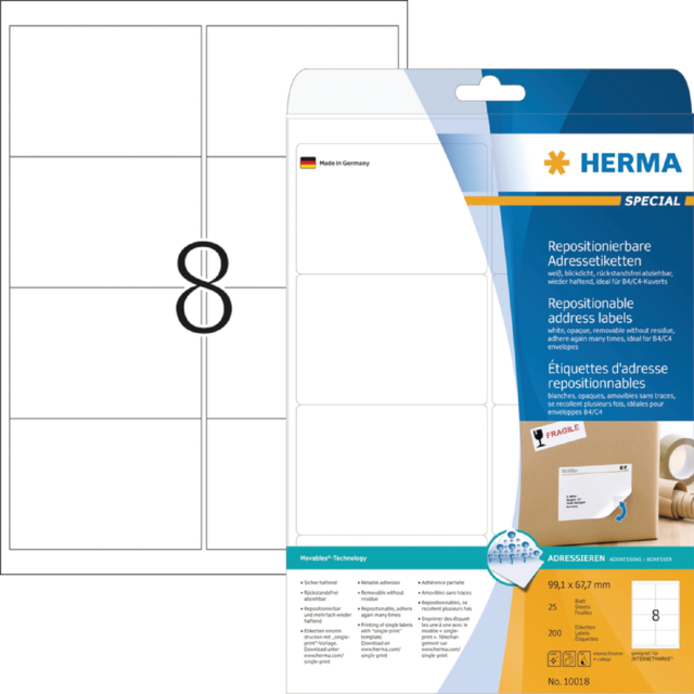 - Dankzij de “Free-to-move”-coating hechten HERMA Movables uitstekend op alle gladde, droge, onbeschadigde en stofvrije oppervlakken, en kunnen de etiketten verwijderd worden zonder lijm- of papierresten achter te laten en zonder de ondergrond te beschadigen. /li li Het hoogwaardige materiaal waarborgt uitstekende printresultaten op alle laser-en inkjetprinters, kopieermachines, multifunctionele apparaten, kleurenlaserprinters en kleurenkopieermachines. /li li Van hoogwaardig speciaalpapier, chloorvrij gebleekt, voorzien van oplosmiddelvrije lijmlaag. /li li Storingvrije verwerking dankzij veiligheidsrand rondom en optimaal vlakke ligging. /li li Zelfklevende etikettenvellen in bladformaat DIN A4. /li li Dankzij de “Free-to-move”-coating hechten HERMA Movables uitstekend op alle gladde, droge, onbeschadigde en stofvrije oppervlakken, en kunnen de etiketten verwijderd worden zonder lijm- of papierresten achter te latenen zonder de ondergrond te beschadigen. /li li HERMA Movables zijn probleemloos verplaatsbaar en kunnen weer opnieuw worden geplakt. /li li Ideaalvoor de flexibele etikettering, voor het tijdelijk kenmerken en voor oppervlakken die niet beschadigd mogen worden. /li li Het hoogwaardige materiaal waarborgt uitstekende printresultaten op alle laser-en inkjetprinters, kopieermachines, multifunctionele apparaten, kleurenlaserprinters en kleurenkopieermachines. /li li Van hoogwaardig speciaalpapier, chloorvrij gebleekt, voorzien van oplosmiddelvrije lijmlaag. /li li Storingsvrije verwerking dankzij veiligheidsrand rondom en optimaal vlakke ligging. /li li Pak à 25 vel. /li li HERMA Movables etikettenvellen. /li li Dankzij de “Free-to-move”-coating hechten uitstekend op alle gladde, droge, onbeschadigde en stofvrije oppervlakken, en kunnen de etiketten verwijderd worden zonder lijm- of papierresten achter te laten. /li li Uitstekende printresultaten. /li li Stori