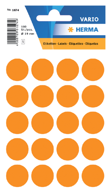1874 – HERMA Gekleurde Etiketten Schrijfpapier 1874 Ø19mm 100st Fluor Oranje 1 Pak