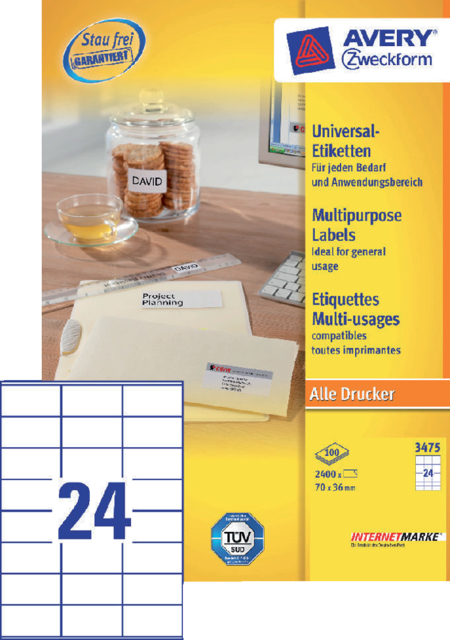 3475 – Avery Universal Etiket Zweckform no:3475 70x36mm 2.400st Wit