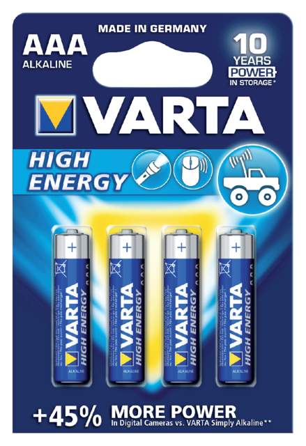 • High Energy is Varta’s krachtigste Alkaline batterij, speciaal ontwikkeld voor apparaten met een grote constante energiebehoefte, zoals draagbare radio’s, gameboys, mp3 spelers en speelgoed.