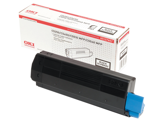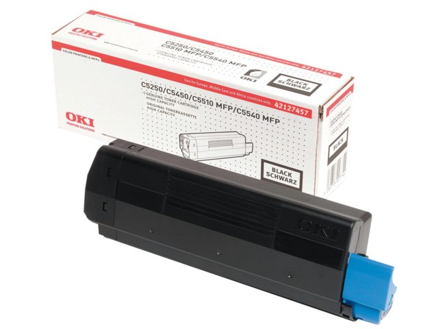 Oki adviseert het gebruik van uitsluitend originele Oki verbruiksmaterialen. Alternatieve verbruiksmaterialen kunnen de prestaties van uw printer nadelig beïnvloeden en bij gebruik ervan vervalt het recht op garantie. Perfect afgestemd op gebruik in de Oki machine en hoogwaardige productie zorgen de originele Oki verbruiksmaterialen voor de beste prestaties, gebruiksduur en rendement. Oki toner C5250 HC zwart Geschikt voor C5250, C5450, C5510MFP en C5540MFP. Capaciteit 5.000 pagina’s. |