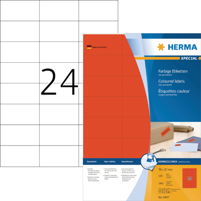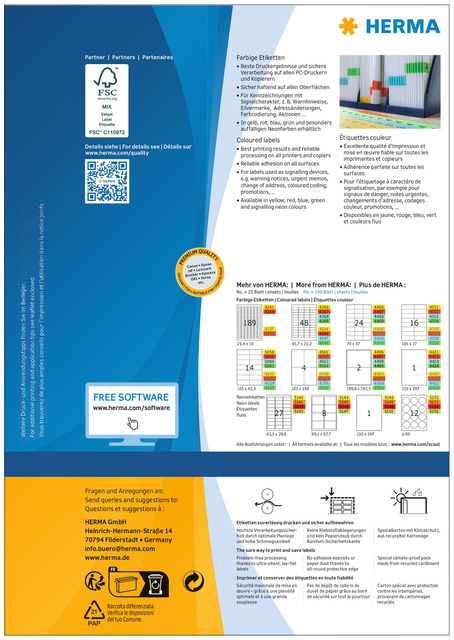 HERMA zelfklevende SuperPrint etiketten op A4 vellen. Perfect voor alle printers (laser/inkjet/matrix), kopieermachines, multifunctionele apparaten, ook voor kleurenlaserprinters / kleurenkopieer- machines geschikt. Hoogwaardig speciaal papier, chloorvrij gebleekt, oplosmiddelvrije kleefstof.
