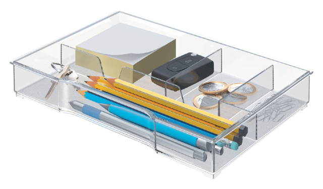 - Geleverd met transparante en beschrijfbare, klemmende labelhouders voor weergave van de inhoud en transparante opbergbak voor het veilig opbergen van kleine bureau-artikelen zoals pennen, paperclips enz.