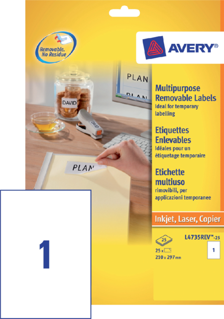 FSC gecertificeerd en 100% recyclebaar. Geschikt voor inkjet/laserprinters en kopieermachines. Ideaal voor tijdelijk gebruik. Perfect afdrukresultaat. Perfecte kleefkracht, maar verwijderbaar zonder resten. Snel en eenvoudig te bedrukken. Templates zijn eenvoudig te downloaden via Avery.eu Zelfklevende etiketten op A4-vellen.