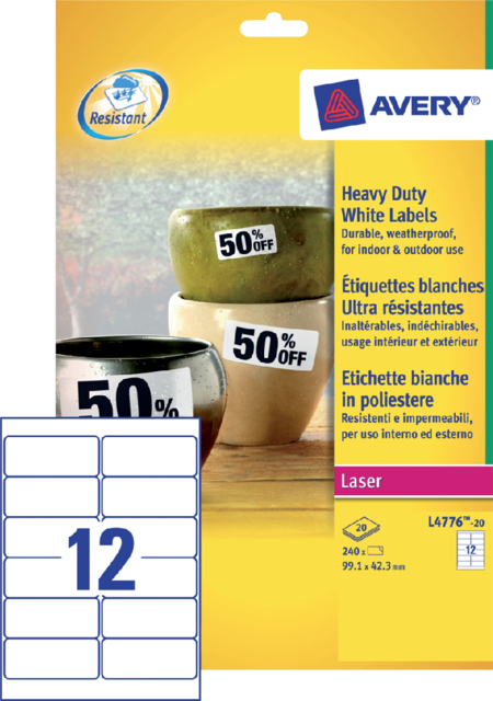 - Polyester etiketten zijn ultra-sterk en bestand tegen vocht, extreme temperaturen (van – 20°C tot +80°C), olie, vetten en UV.