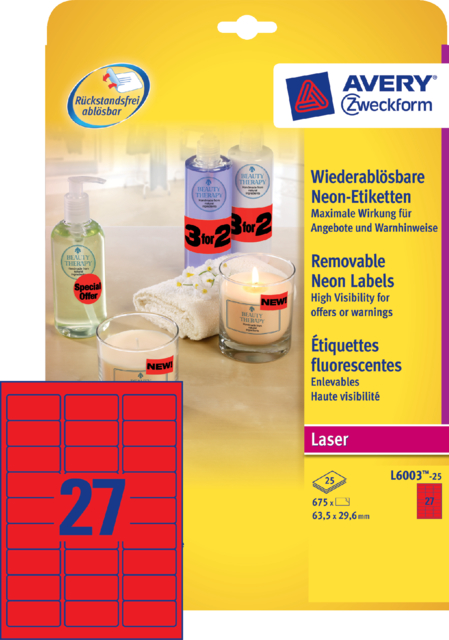L6003-25 – Avery Gekleurde Etiketten Verwijderbaar L6003 63.5×29.6mm 675st Neon Rood 1 Pak