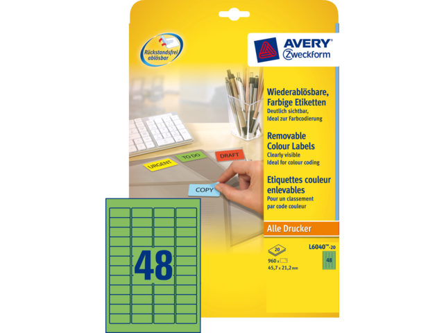 Zelfklevende etiketten op A4-vellen. Geschikt voor (kleuren)inkjet/laserprinters en kopieermachines. Rechte hoeken en veiligheidsranden om alle zijden garanderen een storingvrije doorvoer. Templates zijn eenvoudig te downloaden via Avery.nl Pak à 20vel / 960 etiketten.